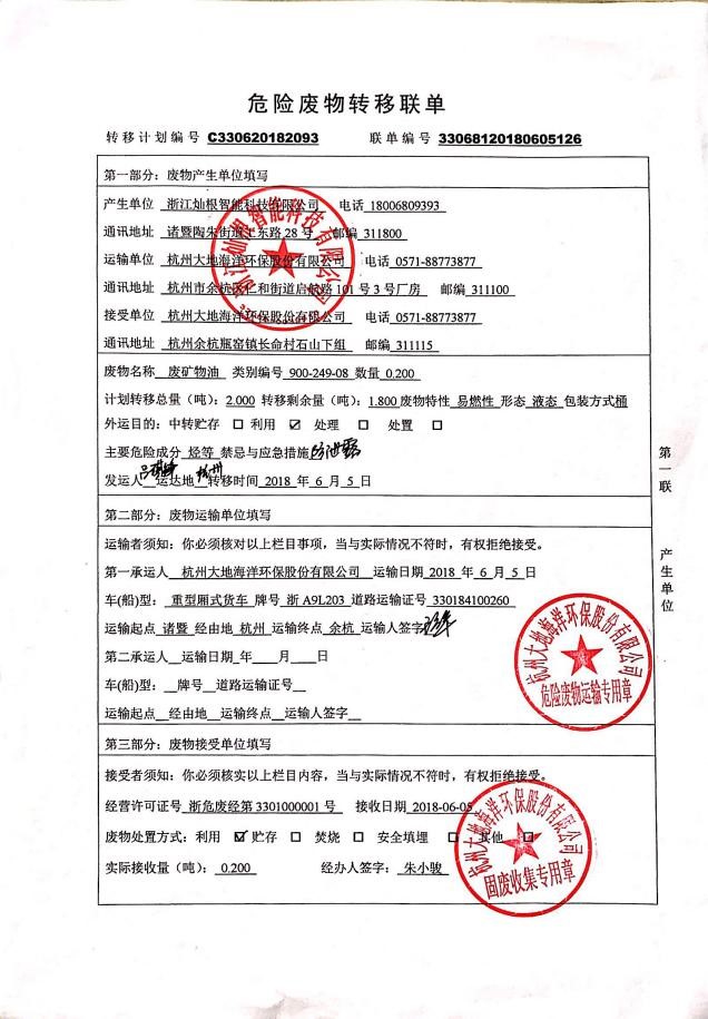 ?关于公司危险废弃物转移处理的声明 浙江灿根智能科技有限公司始创于1988年,注册资金5000万,年销售总额约4.8亿元。目前公司占地面积160亩,员工300人(其中研发人员48人);公司为...